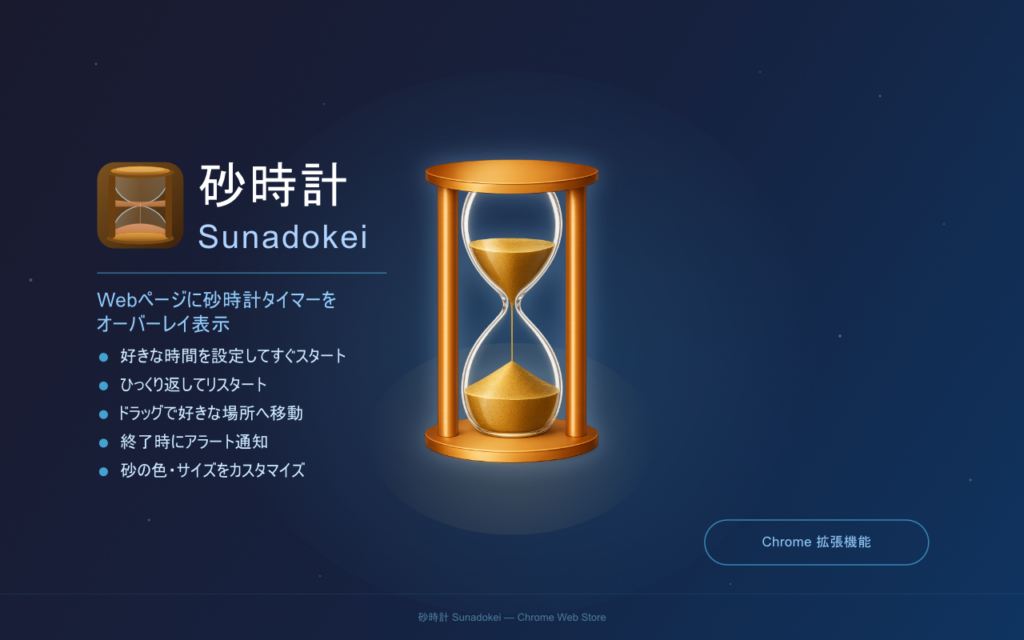 Webページ上に砂時計を表示するタイマーChrome拡張機能 砂時計 Sunadokei リリースしました。