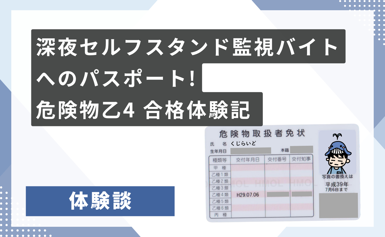 最初は半信半疑でしたが、実際にアルバイトを体験した方のブログや記事を読んでいると信憑性があり、自分もやってみたいと思い立ったのですが、『夜間セルフガソリンスタンド監視』のアルバイトに受かるには、危険物取扱者乙種4類という危険物に関する資格がいることを知り受験することを決めました。