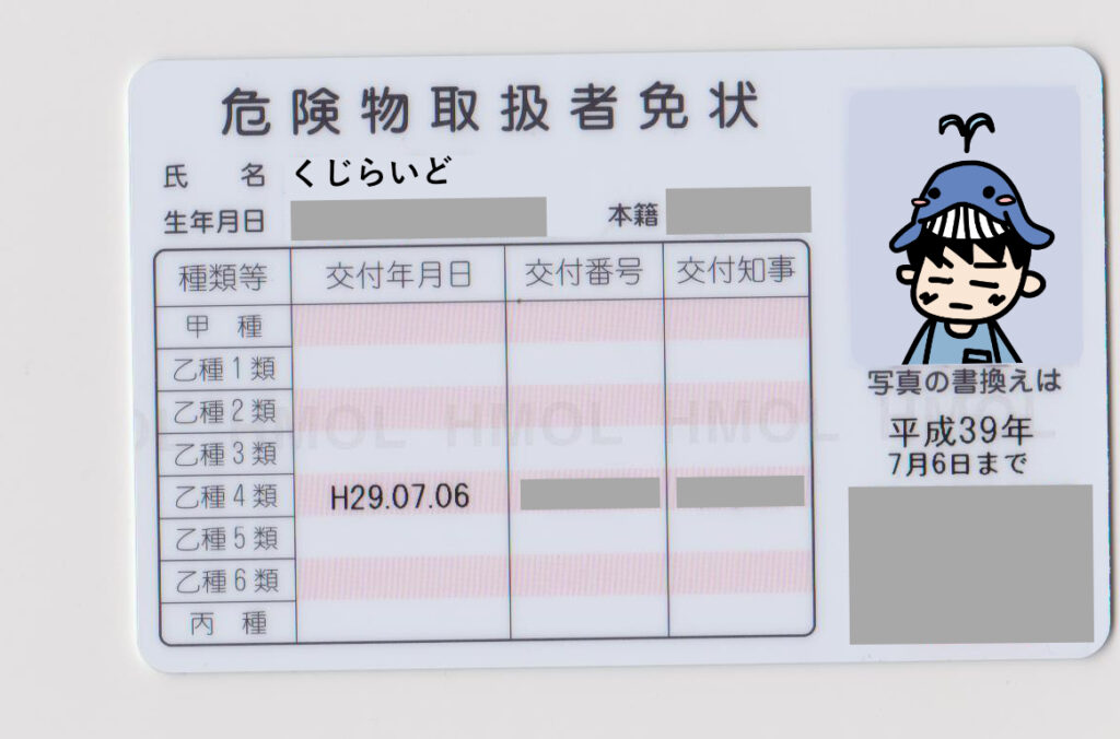 くじらいど危険物乙4が初めて取得した国家資格という方は多いのではないでしょうか。自分は、危険物乙4が初めて取得した国家資格では無かったのですが、危険物乙4が色々な資格を習得するきっかけになりました。
